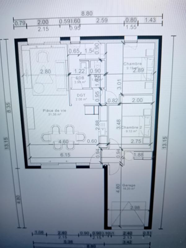 2 chambres, une salle de bains avec douche à l’italienne et meuble vasque complet, un WC indépendant , une pièce de vie avec cuisine ouverte et 2 baies ALU coulissantes donnant sur le jardin, un garage de 16 m² vient complèter ce projet.