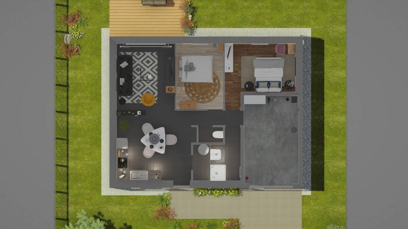 Découvrez le modèle ZEN G, maison plain-pied moderne de 66.0 m² habitables, pensée pour un agencement optimisé et un confort durable. Équipée d’une pompe à chaleur air-air, cette maison offre des prestations contemporaines et une livraison clé en main.